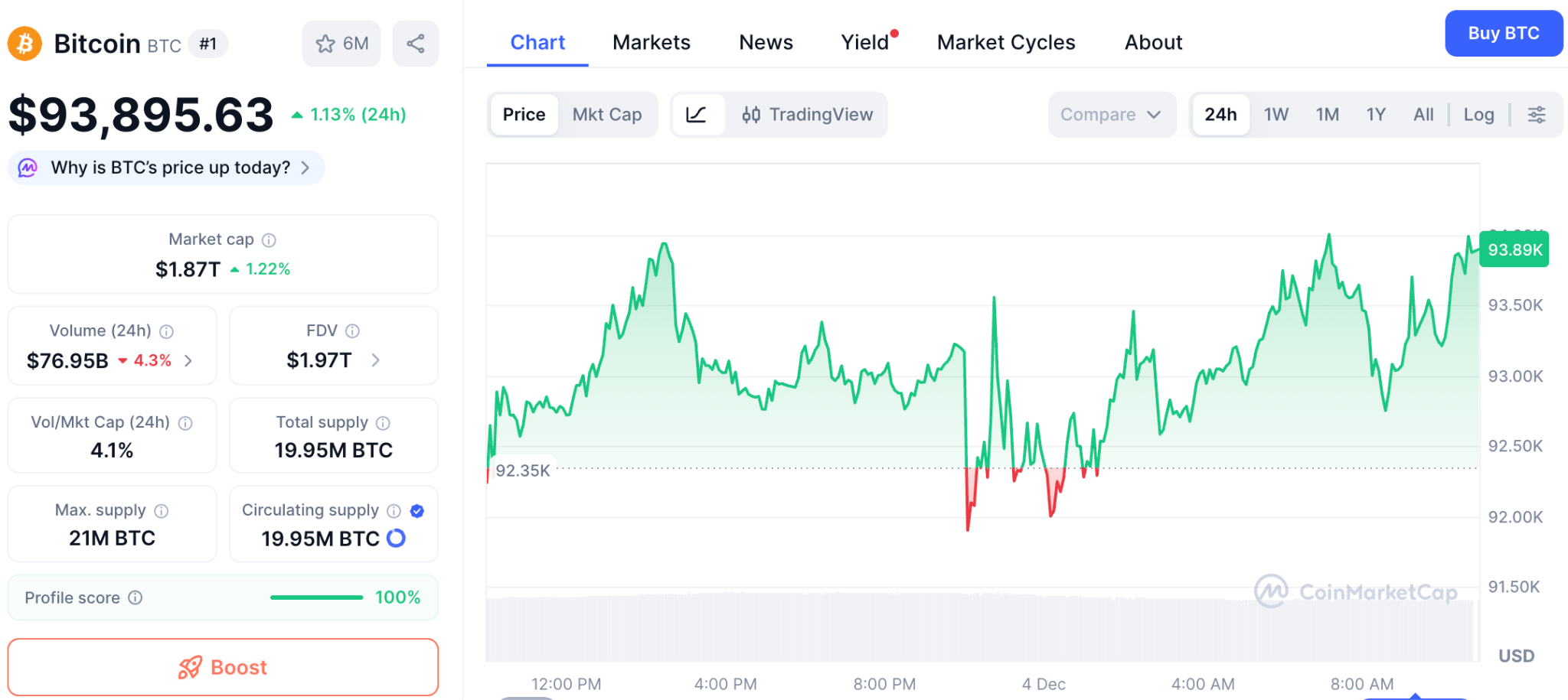 加密市場延續升勢,比特幣今晨一度觸及94,162美元,持穩於9.3萬美元上方,單日漲幅1.13%。