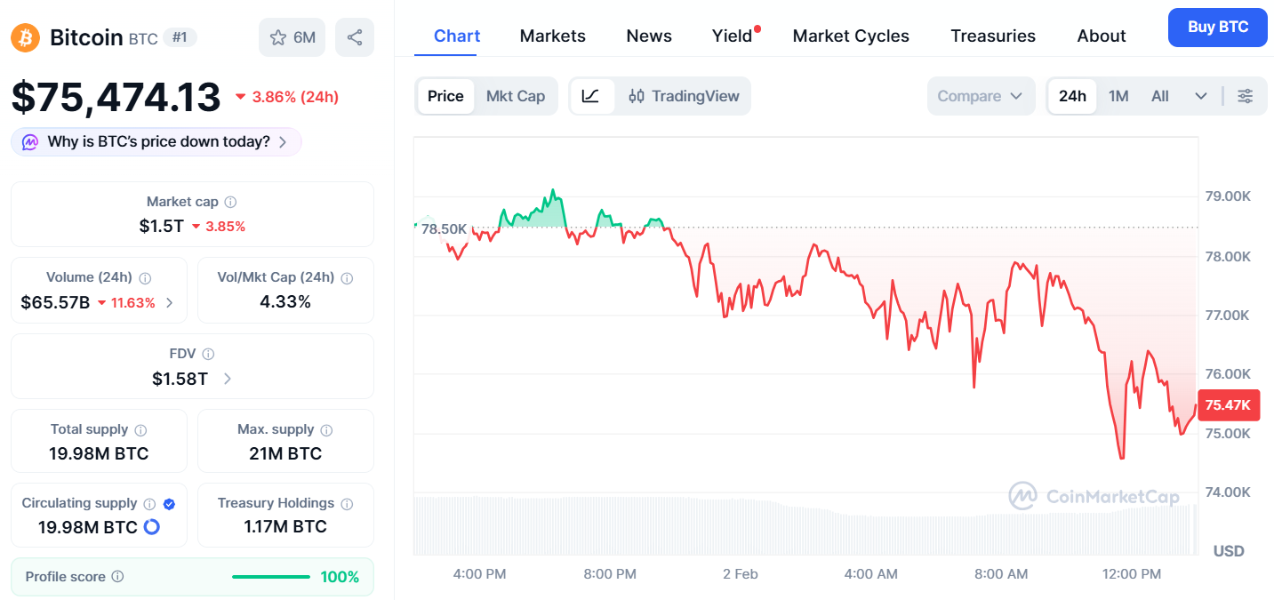 根據 TradingView 數據,比特幣價格在 75,500 美元附近徘徊。