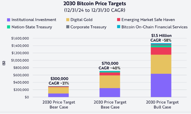 根據 ARK 最新模型,比特幣 2030 年預估價為三種情境:熊市 30 萬、基準 71 萬、牛市 150 萬美元。 Puell 指出,長期動能來自機構擴大配置與比特幣作為「數位黃金」角色的強化。