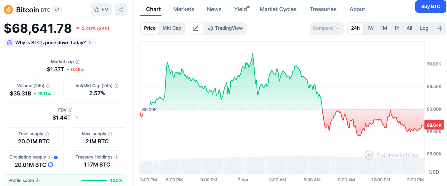 停火希望轉瞬即逝。伊朗外交部拒絕接受美方 15 點協議,稱「除非獲全額戰爭賠償,否則不重開海峽」。消息傳出後,比特幣從 70,000 美元高點回落至 68,641 美元,短線反轉明顯。