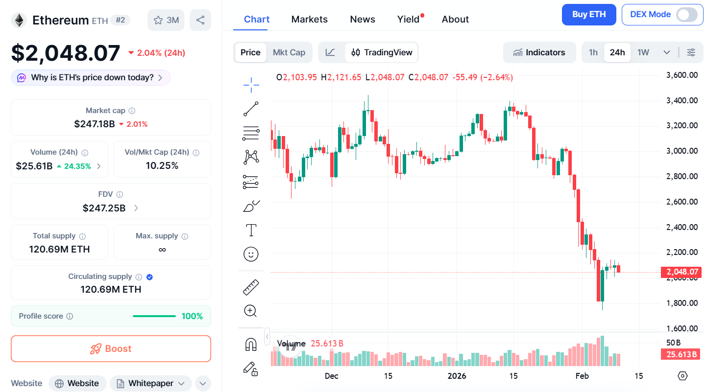 以太坊走勢更為劇烈,從 2,008 美元區間直衝 2,150 美元後快速回落,目前 2,048 美元。短線波動明顯放大。