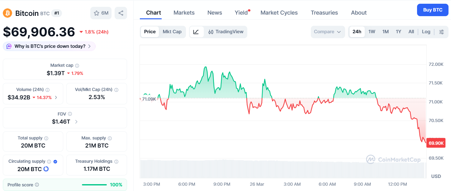 比特幣自 68,000 美元下方反彈,最高觸及 72,000 美元後於 7 萬美元附近徘徊。
