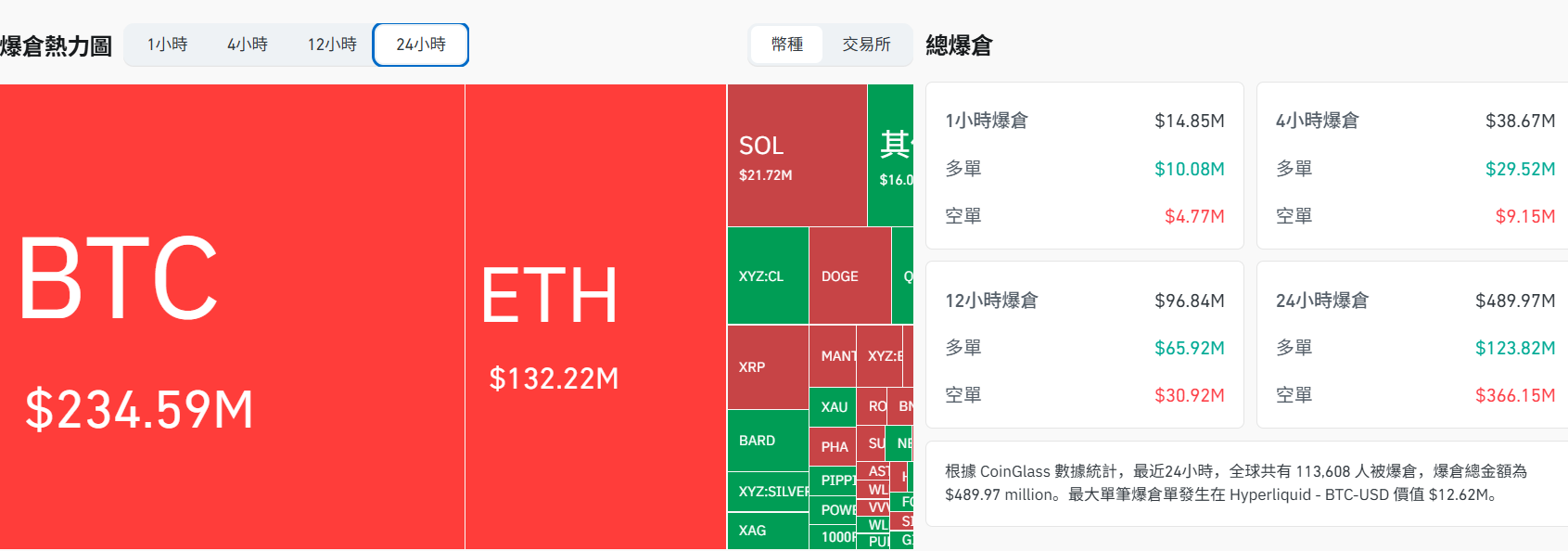 根據 統計,過去 24 小時內共有超過 11 萬人被爆倉,總金額約 4.9 億美元,其中空頭清算佔 3.66 億美元。市場的強勢反彈令過度放空的槓桿投資人遭受大規模清算,顯示部分資金仍處於短線「軋空」格局中。