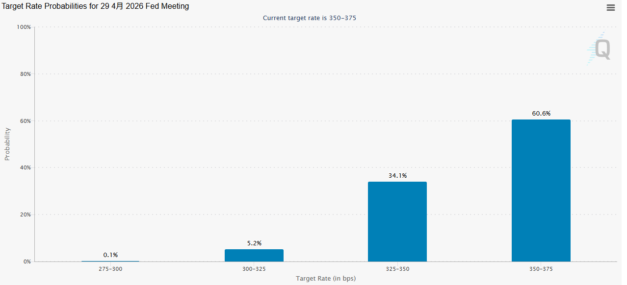 美國 12 月 CPI 公布後,根據 CME Fed Watch Tool 數據,市場預估 1 月維持利率在 3.50%–3.75% 機率最高;3 月與 4 月降息機率分別降至 24.9% 與 34.1%。