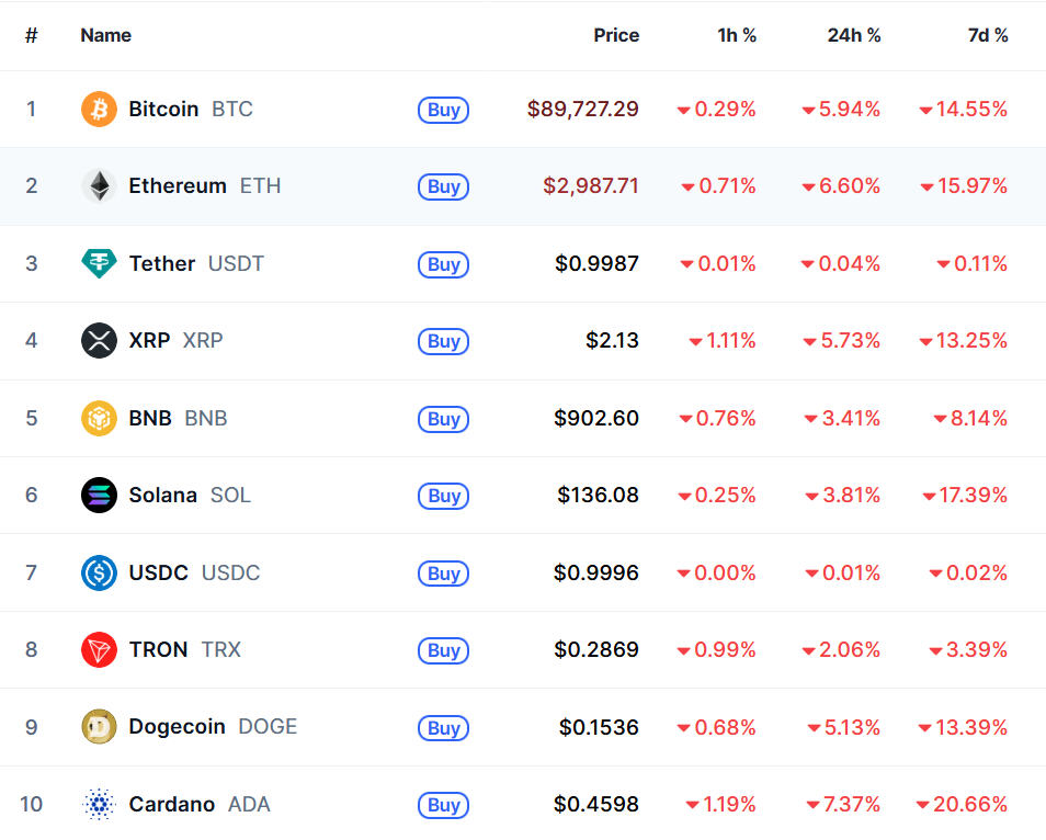 今日上午比特幣(BTC)價格再度走弱,行情一度跌破九萬美元,低點觸及 89,602 美元。從今年高點回落至今,跌幅已接近 30%,為半年來的最低區間。