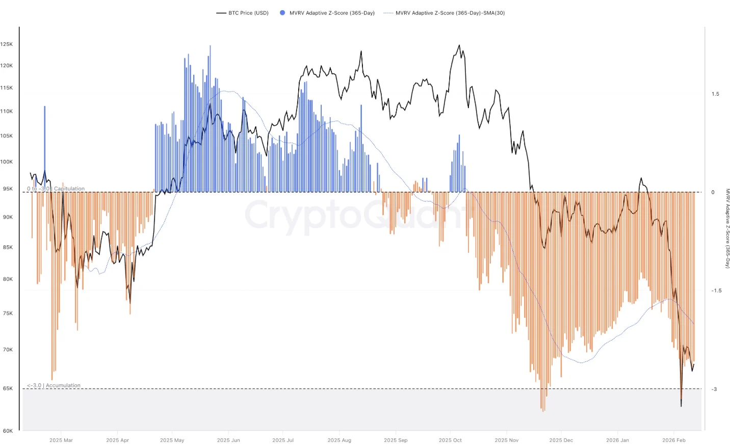 CryptoQuant 統計顯示,比特幣 MVRV(365 日) Z-Score 跌至 -2.66,為明顯的投降訊號。鏈上分析師 GugaOnChain 指出:「當前讀值證明 BTC 依舊深陷投降階段,也意味著長期投資者已進入高度恐慌。」