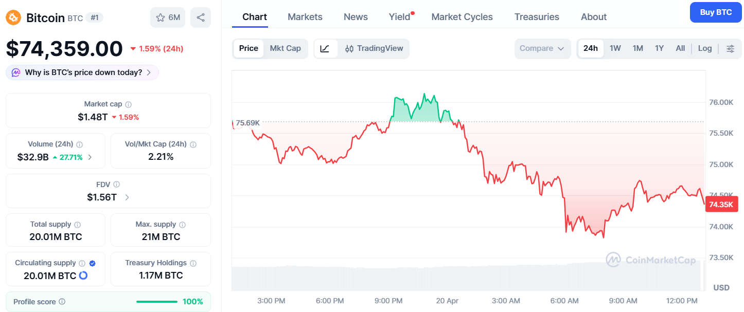 比特幣昨晚上攻 $76,000 關口失敗後價格快速回落,目前價格為 $74,559 美元。