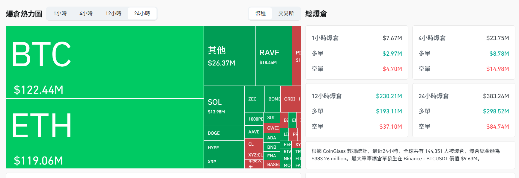 根據 CoinGlass 數據, 24 小時全網合約爆倉金額 $3.832 億美元, 144,351 名交易者遭清算。最大單筆爆倉發生於 Binance BTC-USDT 合約,金額約 $963 萬美元。