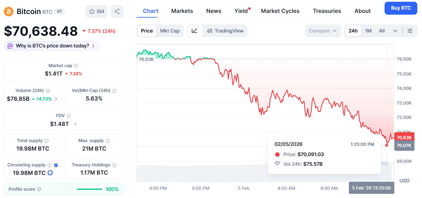 比特幣自去年 10 月 12.6 萬美元高點一路下滑,今晨跌至 70,091 美元,跌幅逾 40%。