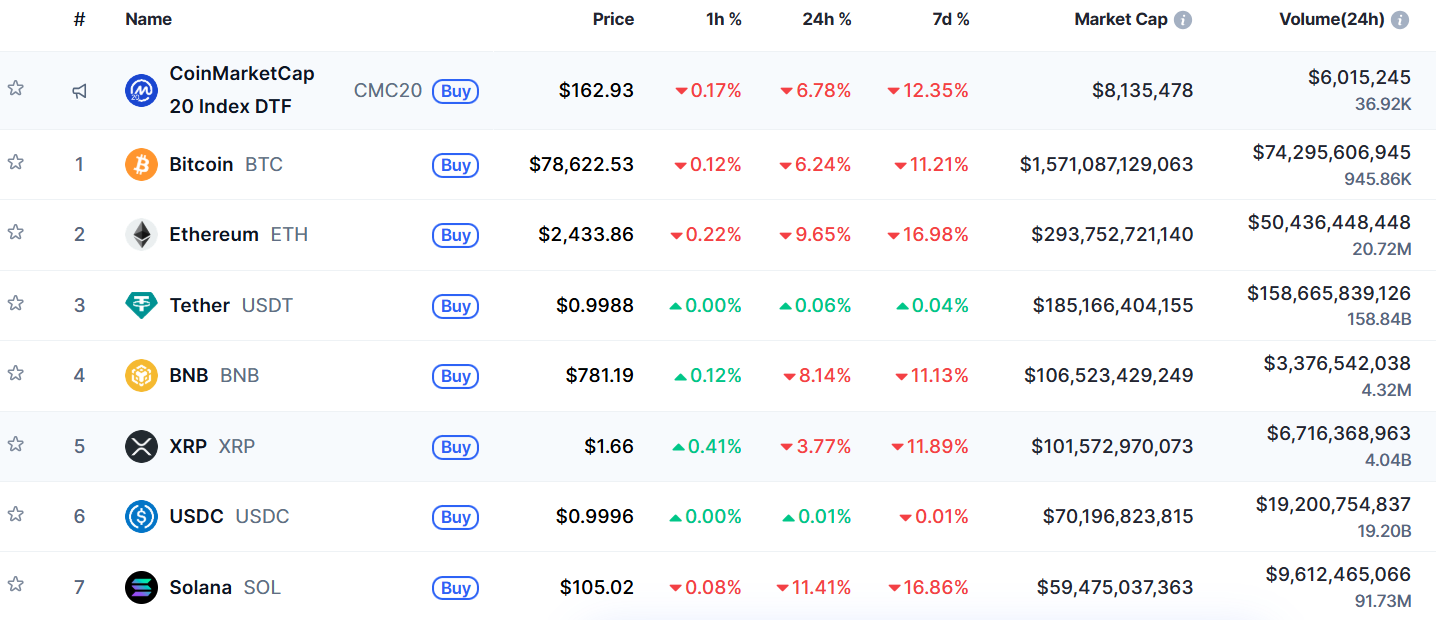 在短短 12 小時內,加密貨幣市場再度出現「瀑布式」下跌。比特幣自 8 萬美元上方急跌,一度插針至 75,678 美元,為 2025 年 4 月以來最低價。過去 24 小時跌幅一度超過 6% 後小幅反彈至 7.8 萬美元附近,市場情緒陷入極度恐慌。