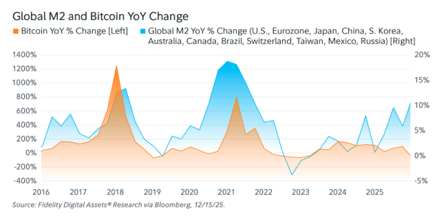 分析人士認為,目前的市場條件與歷史上多次牛市啟動期相似。隨著各主要央行停止量化緊縮(QT)並重新釋放流動性,全球M2貨幣(M2代表市場中可流通的廣義貨幣總量,用以衡量資金流動性)供應量持續上升,支撐風險性資產回暖。