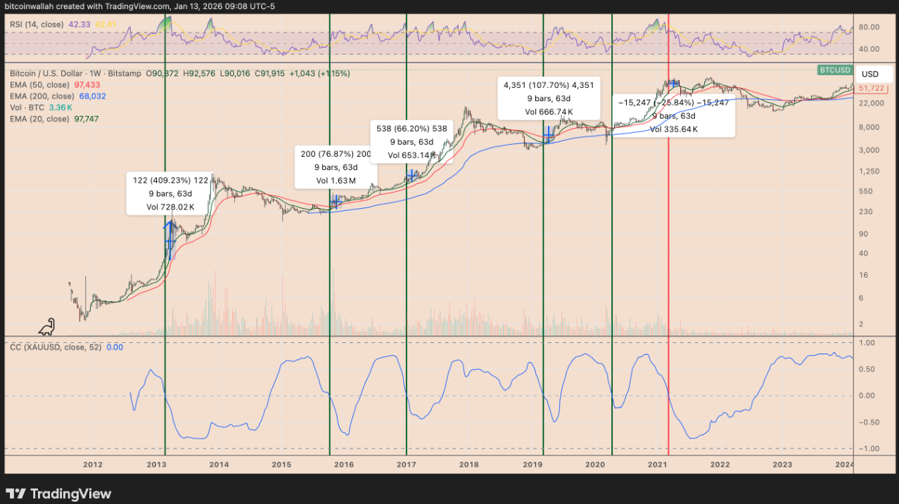 根據Cointelegraph報導,比特幣與黃金的52週相關性在近期降至零,預計在1月底前可能轉為負值。回顧過往四次出現類似情形的周期,比特幣在脫鉤後平均於兩個月內上漲約56%,顯示其多頭動能往往隨負相關的出現而增強。