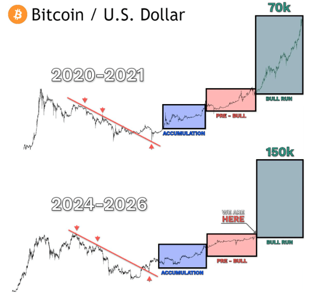 根據加密分析師Midas 長週期分形模型,比特幣目前的價格結構與2020至2021年的牛市階段高度相似。模型顯示比特幣已完成長期震盪與累積期,正逐步邁向拋物線式的加速階段。若該模式持續發展,預估未來兩到三個月比特幣將再度出現約50%至60%漲幅,價格有望站上14.4萬至15萬美元區間。