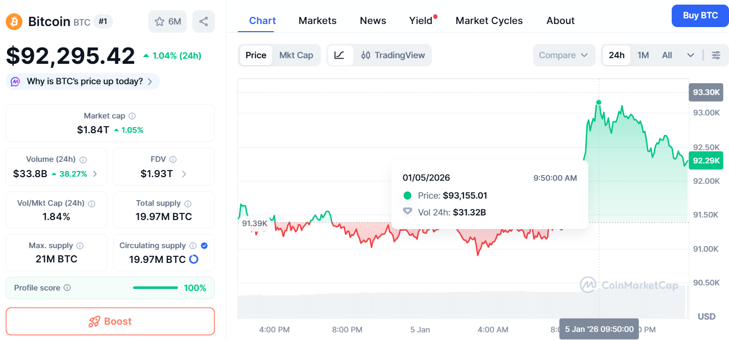 在華爾街長週末交易清淡之際,比特幣(BTC)今日清晨快速拉升,觸及 93,300 美元創近三週高點,目前價格為92,295美元。短線關鍵為 92,000 美元支撐,若能突破 95,800 美元,市場預期將再度挑戰 10 萬美元整數大關。