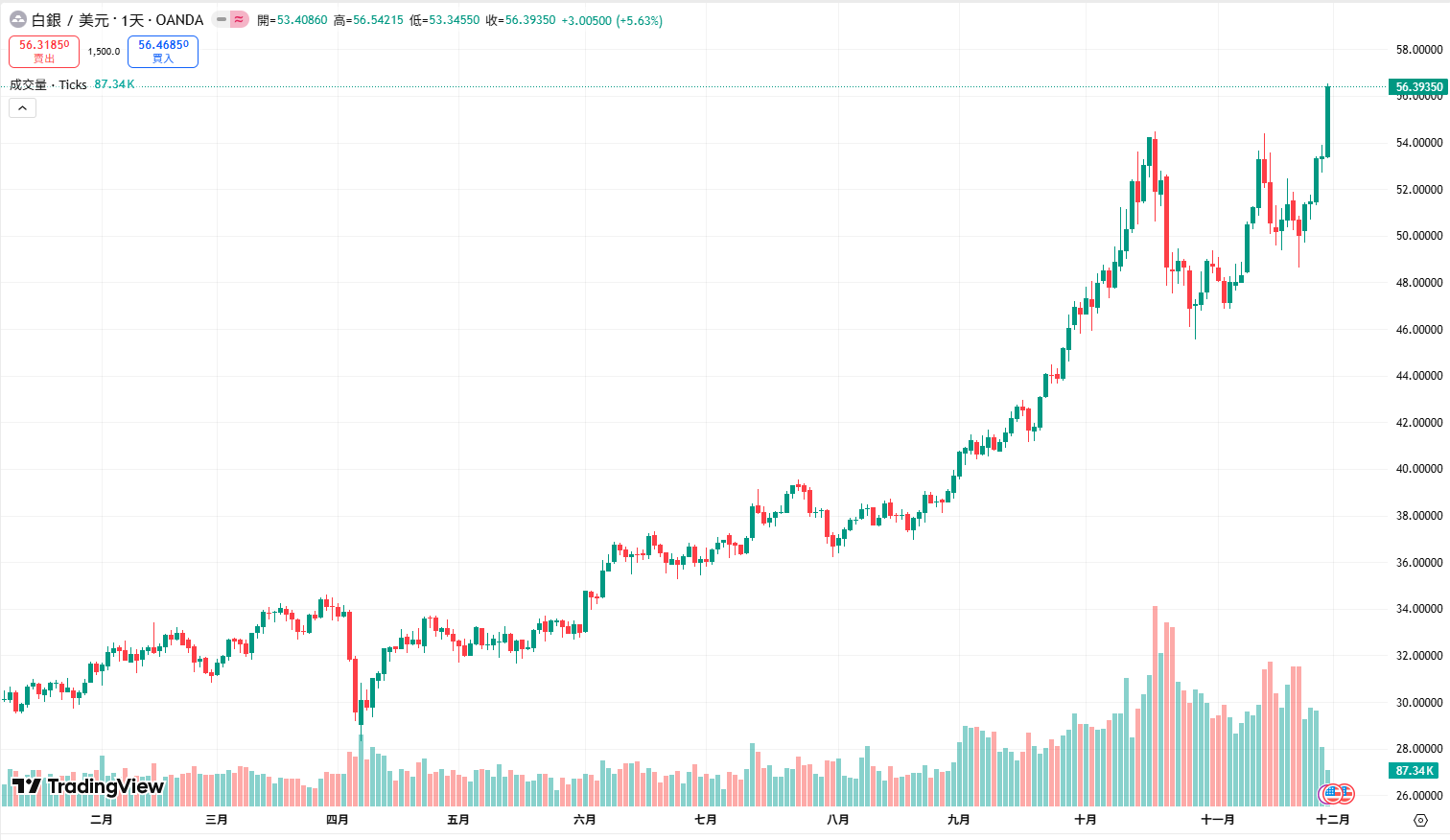 11 月 28 日晚間,國際貴金屬市場延續漲勢。現貨白銀突破 56 美元/盎司,刷新歷史紀錄,日內漲幅近 3%;現貨黃金升至 4200 美元/盎司,為 11 月 中旬以來首見。白銀漲勢除避險買盤外,也受到光伏、電動車與 AI 伺服器產業的實體需求推動。