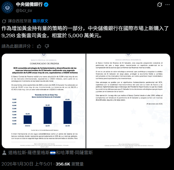 薩爾瓦多中央銀行於 1 月 29 日宣布,已斥資 5000 萬美元購入實體黃金,使該國黃金總儲備增至約 3.6 億美元,持有量約 67,403 盎司。