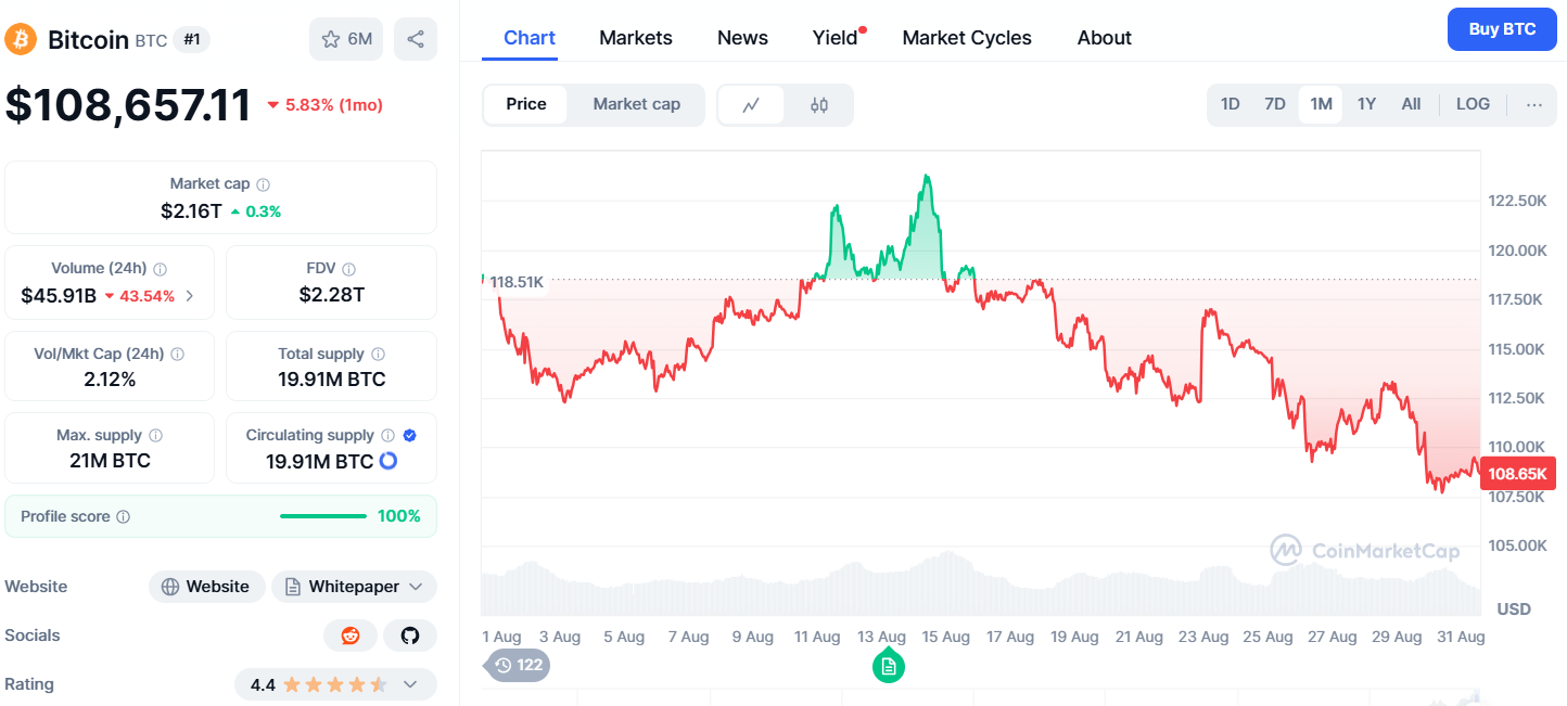 比特幣自 8 月 14 日創下約 124,500 美元歷史新高後,已回調近 13%,並跌破 50 日指數移動平均線(EMA),顯示短期仍有下行壓力。