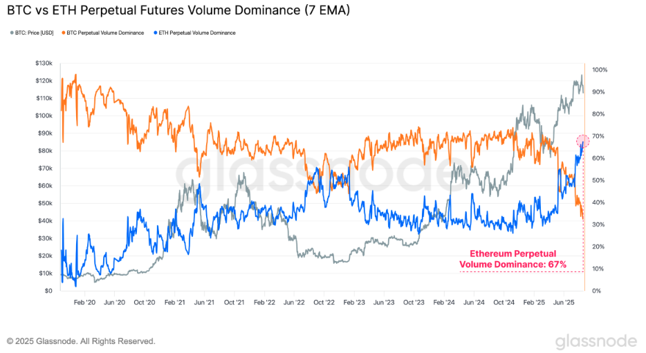 衍生品市場反映出機構參與度。Glassnode數據顯示,ETH期貨未平倉合約佔比升至歷史第四高,與此同時,以太坊永續合約交易量主導地位創下 67% 的歷史新高,;CME在日曆期貨的占比超過七成,傳統金融力量明顯增加。