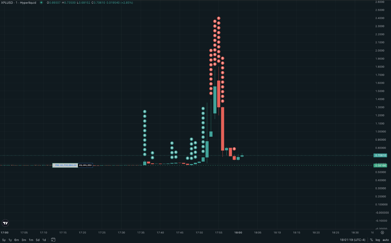 8月27日清晨6時許,Hyperliquid平台上演了一場教科書級的軋空操作。鏈上地址0xb9c0通過存入1600萬美元USDC作為保證金,運用3倍槓桿大舉做多XPL合約。由於該交易對流動性薄弱,巨量買單瞬間吞噬盤口所有賣單,導致XPL價格在5分鐘內從0.6美元飆升至1.8美元,漲幅高達200%。