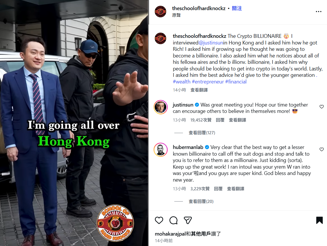 在《The School of Hard Knocks》街訪影片中,主持人 James Dumoulin 表示正在香港街頭採訪富有人士。當被問到成為百萬富翁的時間時,孫宇晨回應:「我是億萬富翁。」他表示於 25 歲時達此資產規模,並介紹自己創建了波場區塊鏈(TRON)。