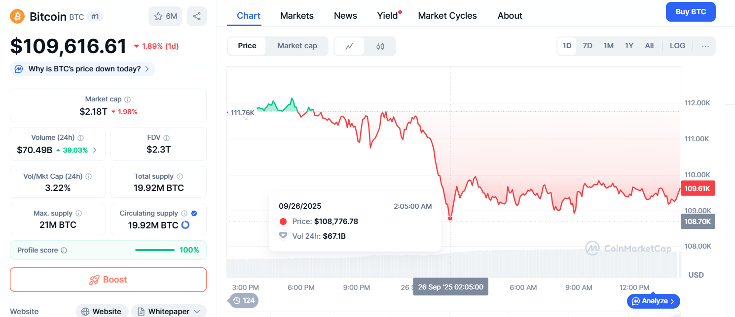 美國時間25日晚間,美股與加密市場同步走低。比特幣跌穿 10.9 萬美元,最低觸及 108,766 美元,24 小時跌幅逾 4%。標普 500 指數連跌三日,顯示投資人對政策前景與資產評價雙重疑慮。