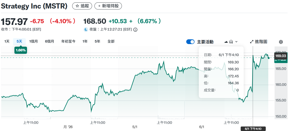 MSCI 公布結果後,微策略(MSTR)在盤後交易上漲近 7%,收復近期跌幅。分析師指出,此次反彈反映市場對「傳統金融與加密資產融合」的長期信心仍然穩定。