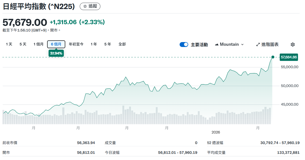 受選舉結果與亞太市場帶動影響,日經 225 指數 2 月 10 日開盤報 56,812.01 點,隨後持續上升。截至目前上漲 1,315.06 點,漲幅 2.33%,報 57,679 點。這是日經指數首次突破 56,000 與 57,000 兩個整數關卡。指數自 1 月 中旬高市宣布提前大選以來,已累計上升 14% 左右。
