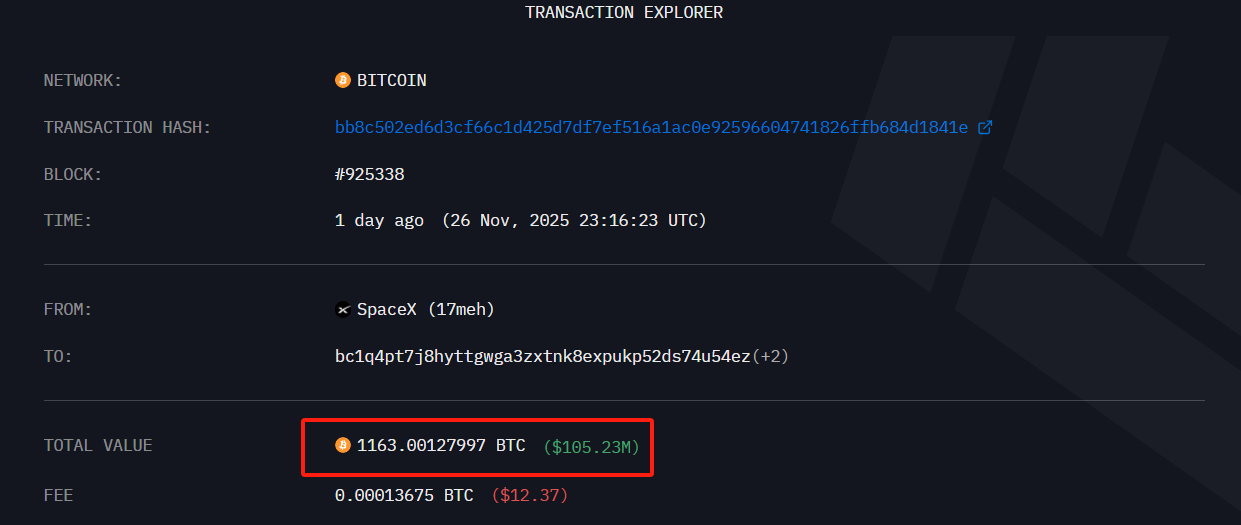 根據Arkham Intelligence數據監測,SpaceX 在 27 日凌晨進行一筆大額比特幣轉帳,共轉出 1,163 枚 BTC,總計價值約 1 億美元。SpaceX 過去曾於熊市減持比特幣,因此猜測可能與套現有關。