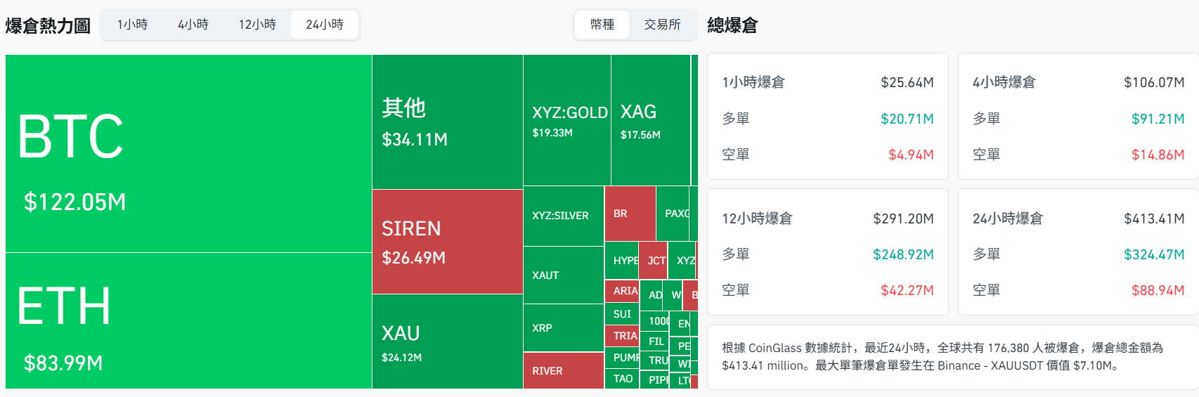 CoinGlass 數據顯示,近 24 小時全網清算金額達 4.13 億美元、共 176,380 名交易者被迫平倉。其中多單爆倉 3.24 億美元,空單 8,894 萬美元。