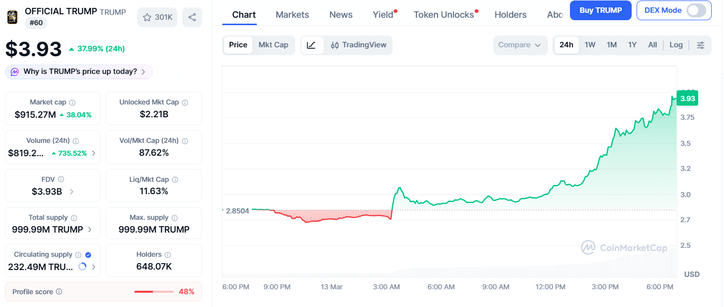 TRUMP 代幣在 3 月 13 日 24 小時內飆升 37%,現報 3.84 美元。主因是官方宣布川普將於 4 月 25 日在佛羅裡達海湖莊園舉辦「加密貨幣與商業午宴」。消息發布後交易量顯著放大,投資人搶買以取得宴會入場門票。
