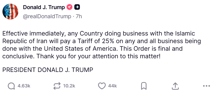 川普在 Truth Social 上宣布,任何與伊朗伊斯蘭共和國維持商業往來的國家,其出口至美國的所有商品與服務,將一律加徵 25% 關稅並立即生效,命令未設過渡期或豁免條款。