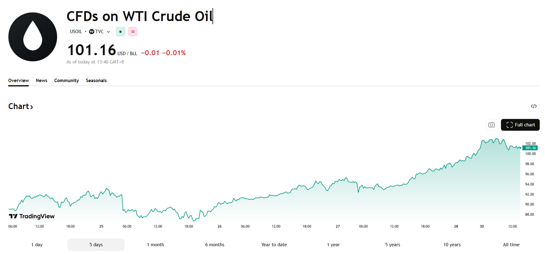 週一國際油價延續漲勢,美油一度突破 $102.5。川普聲稱伊朗已滿足美方 15 項停戰條件中的「大部分」,但仍拒絕透露細節。