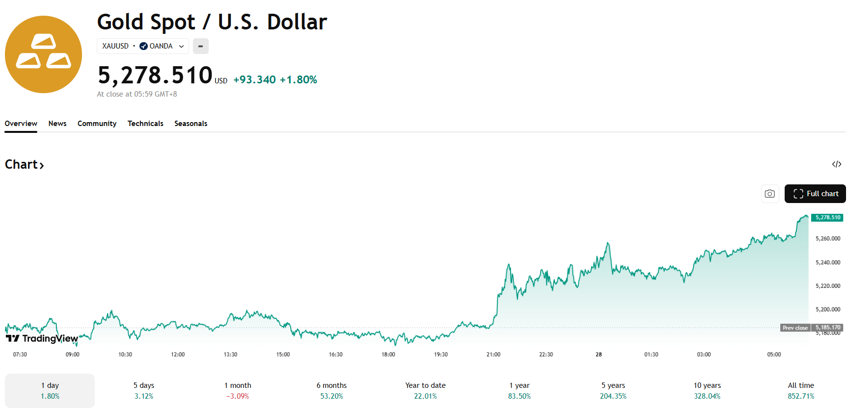 資金從風險資產撤出後迅速湧向貴金屬。黃金現貨價格穩站 5,278 美元/盎司,突破 5,200 美元關口;